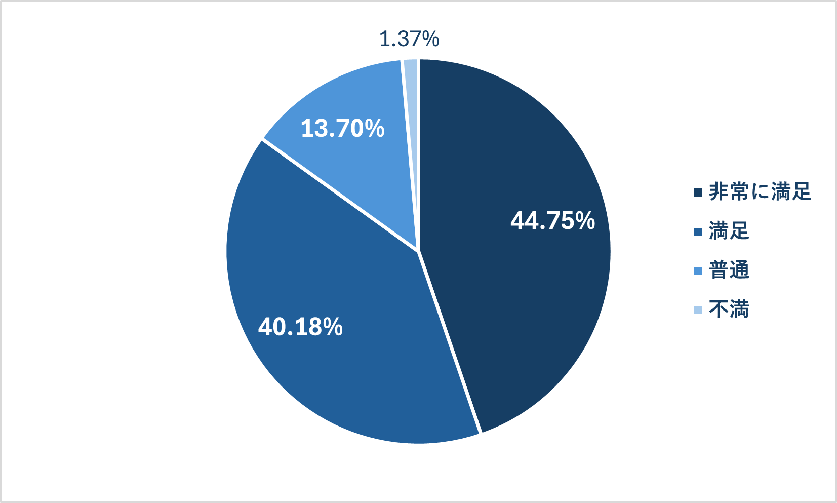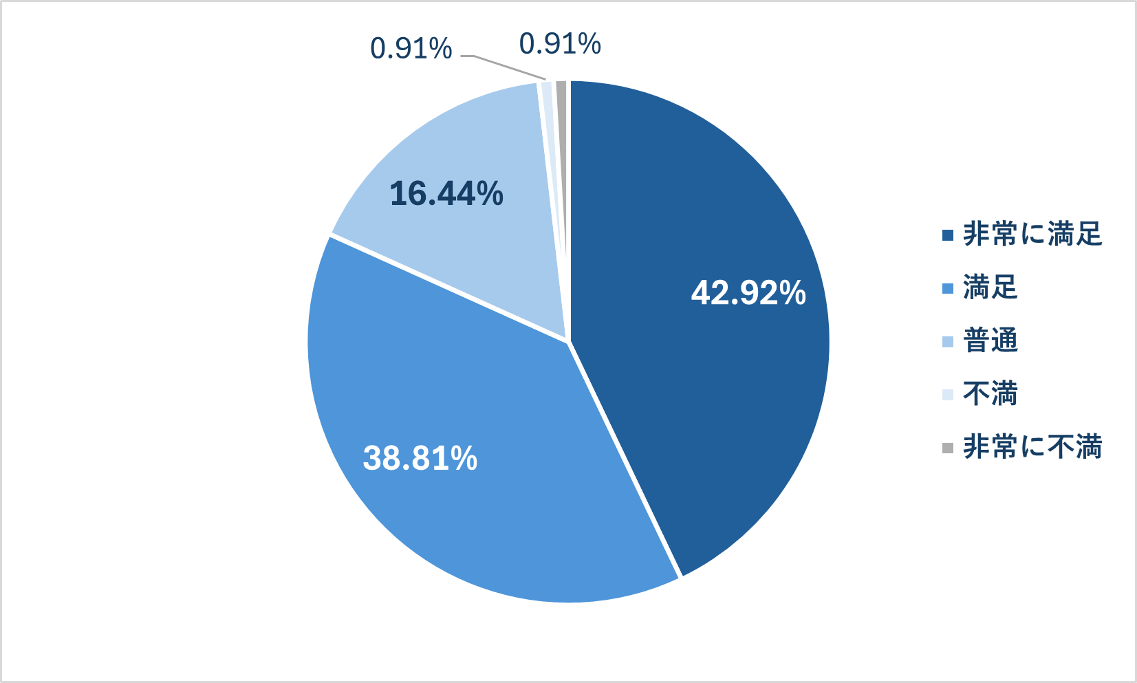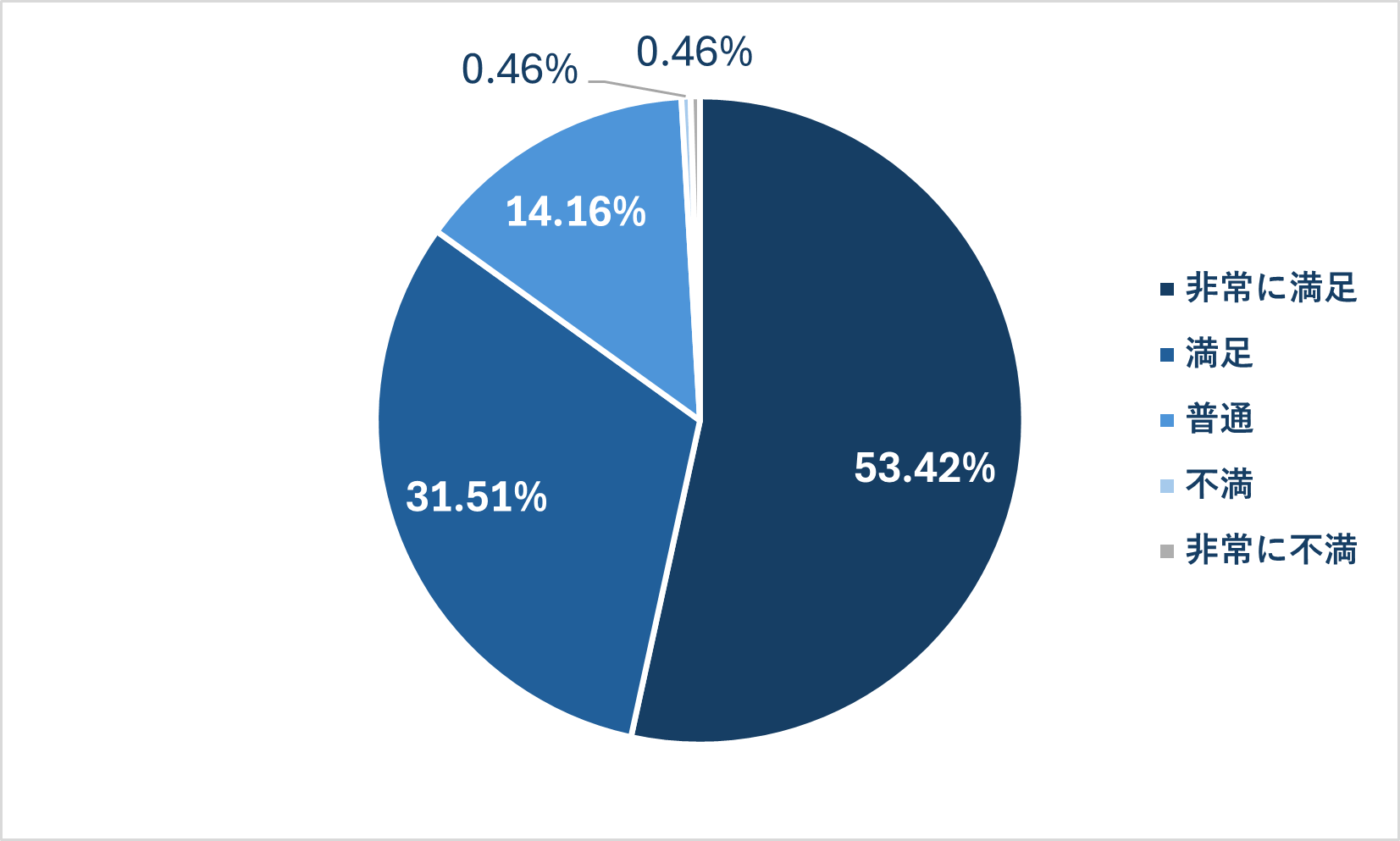 「非常に満足」(53.42%)と「満足」(31.51%)を合計すると、84.93%が問題解決までのスピードに満足していることが分かりました。