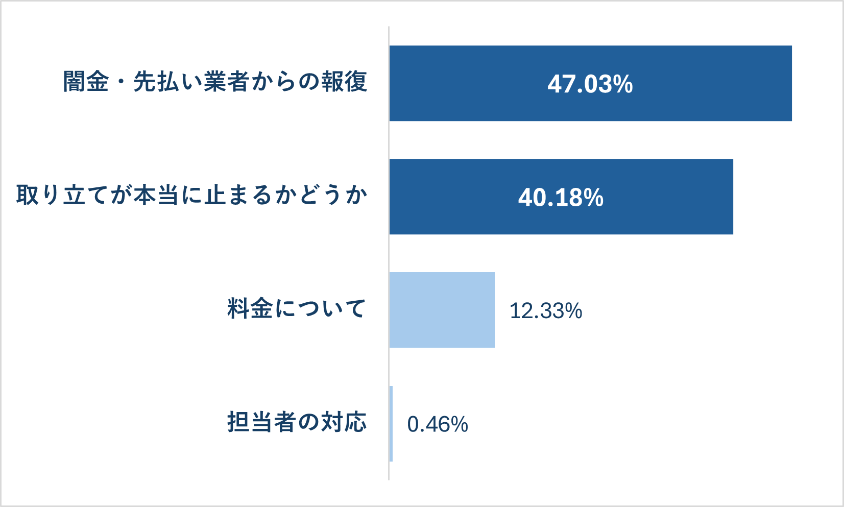「闇金・先払い業者からの報復」が47.03%とされ、不安の順位で最も高く、続いて「取り立てが本当に止まるかどうか」(40.18%)を不安に思っているお客様が多いことが分かりました。