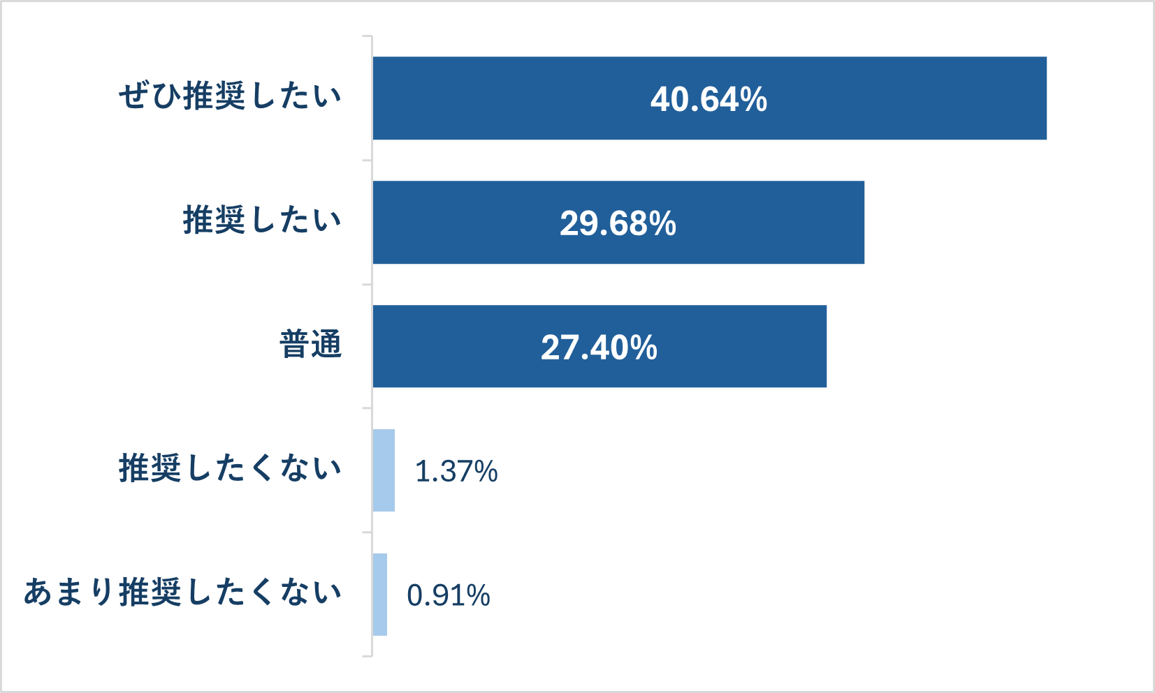 また、「普通」が27.40%である一方、「推奨したくない」や「あまり推奨したくない」は1桁にとどまり、ネガティブな回答が少ないことが見受けられ、とても喜ばしい結果となりました。